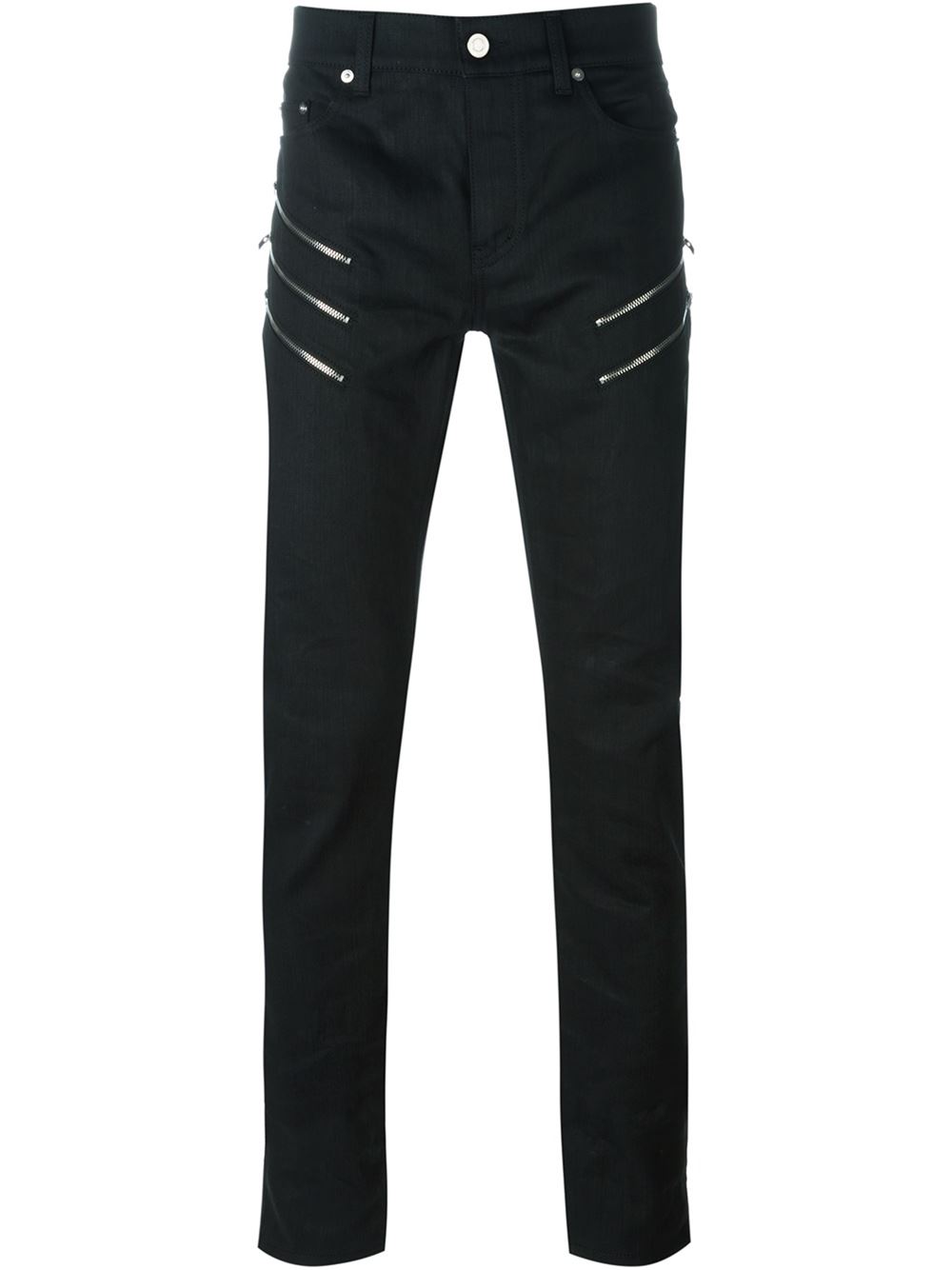 - Saint Laurent 黑色 弹性棉质 拉链细节牛仔裤。 纽扣与拉链开合, 腰带袢, 五口袋设计, 铆钉细节。