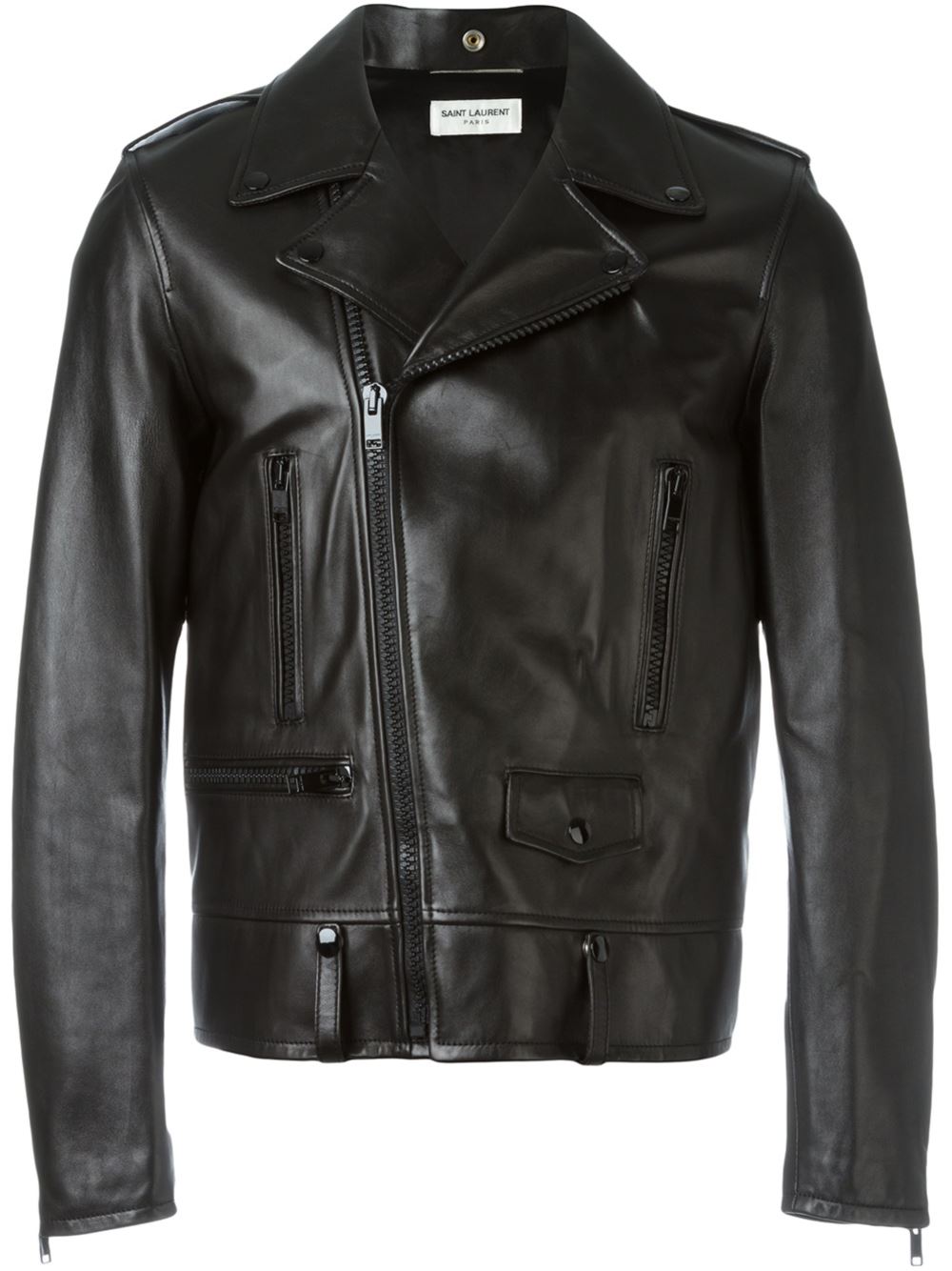 - Saint Laurent 黑色 小羊皮与棉质 经典机车夹克。 经典衣领, 肩章, 偏中心正面拉链, 正面拉链口袋, 一个正面盖袋, 长袖, 拉链袖口, 平直下摆, 全衬里。