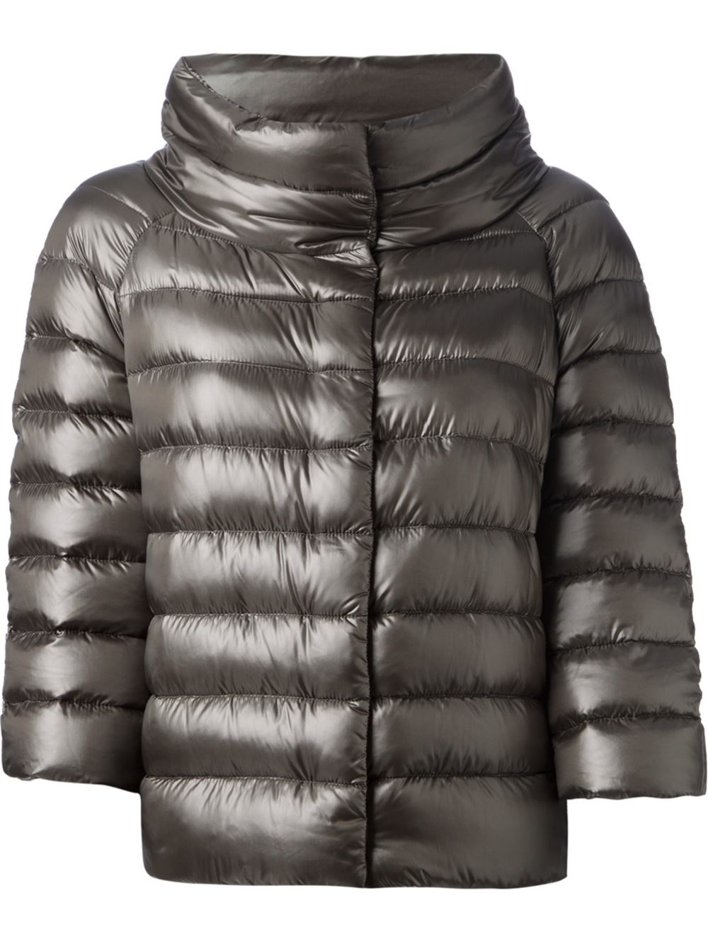 - Herno 灰色 羽绒 高领衬垫夹克。 摁扣, 阔七分袖, 平直下摆。