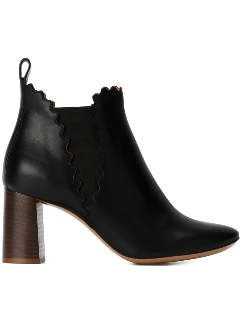 - Chloé 黑色 牛皮 'Lauren'及踝靴。 杏仁形鞋尖, 扇贝形细节, 侧面采用弹性松紧拼接, 后置提鞋环, 叠跟。
