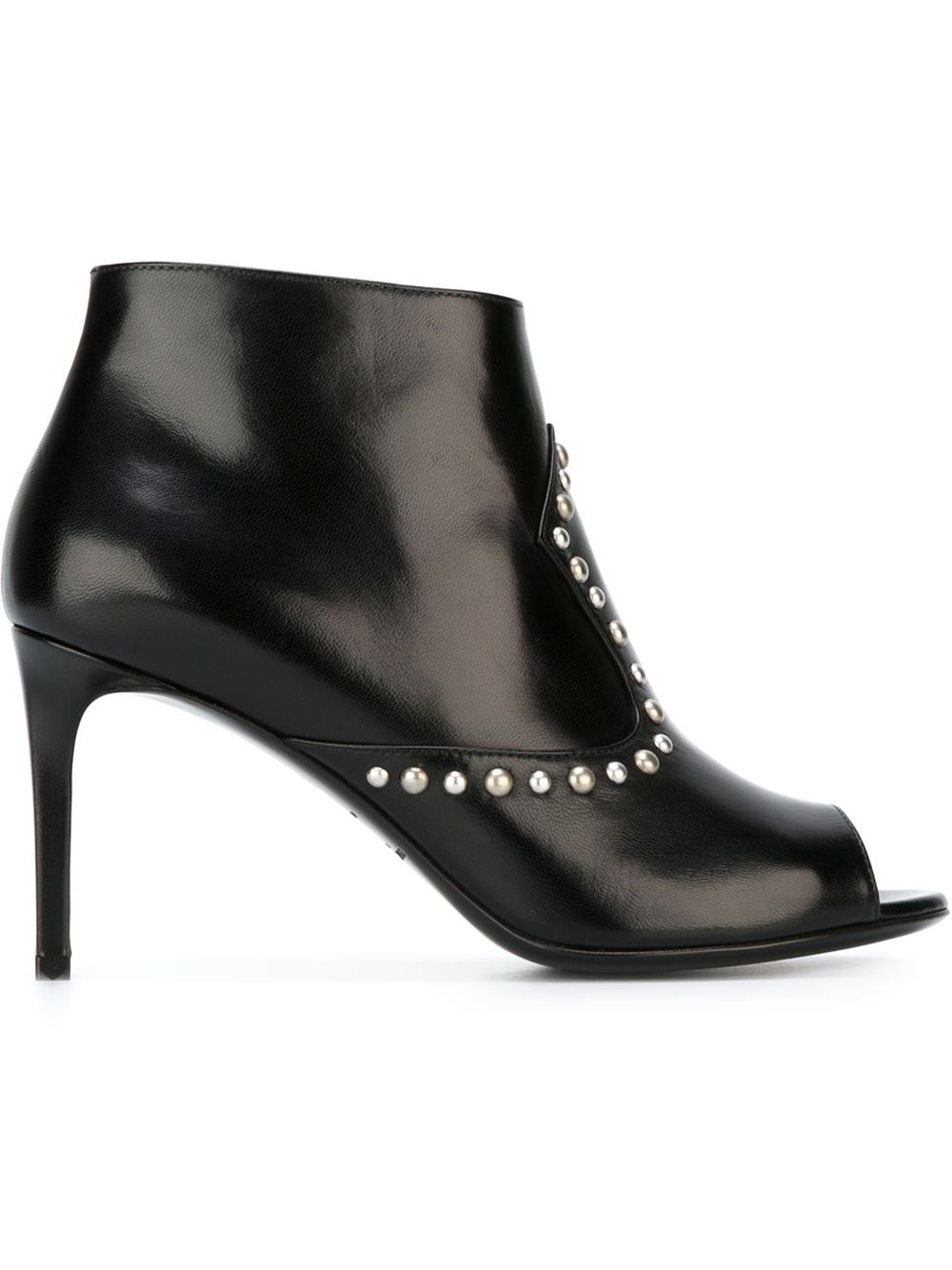 - Saint Laurent 黑色 小牛皮 铆钉露趾及踝靴。 鱼嘴头, 侧置拉链, 银色铆钉, 细高跟。