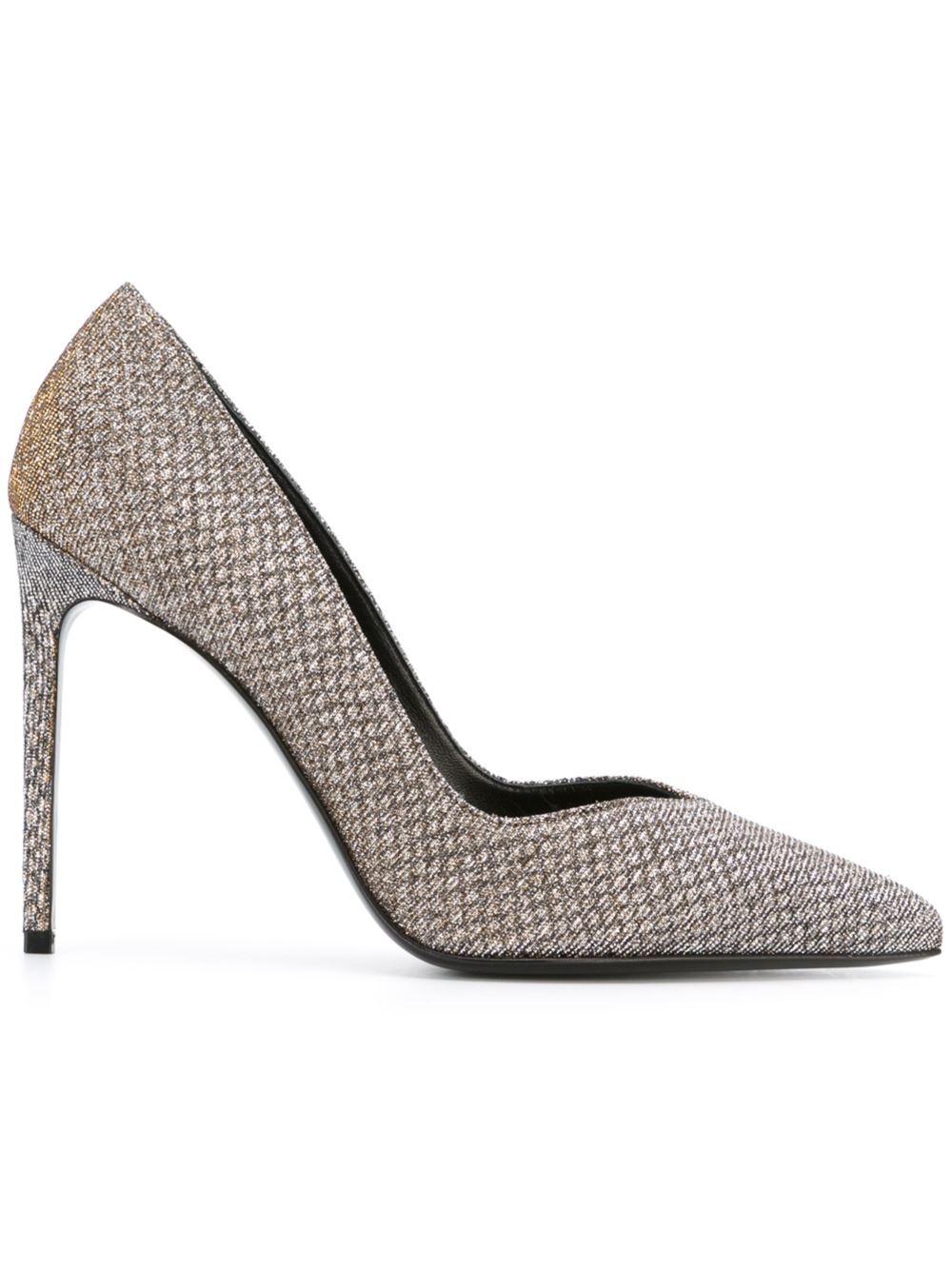 - Saint Laurent 银色 牛皮与金丝 'Paris'高跟鞋。 尖头, 鞋垫饰有品牌标识, 穿套式, 细高跟。这件商品尺码偏大,请选择小半号。