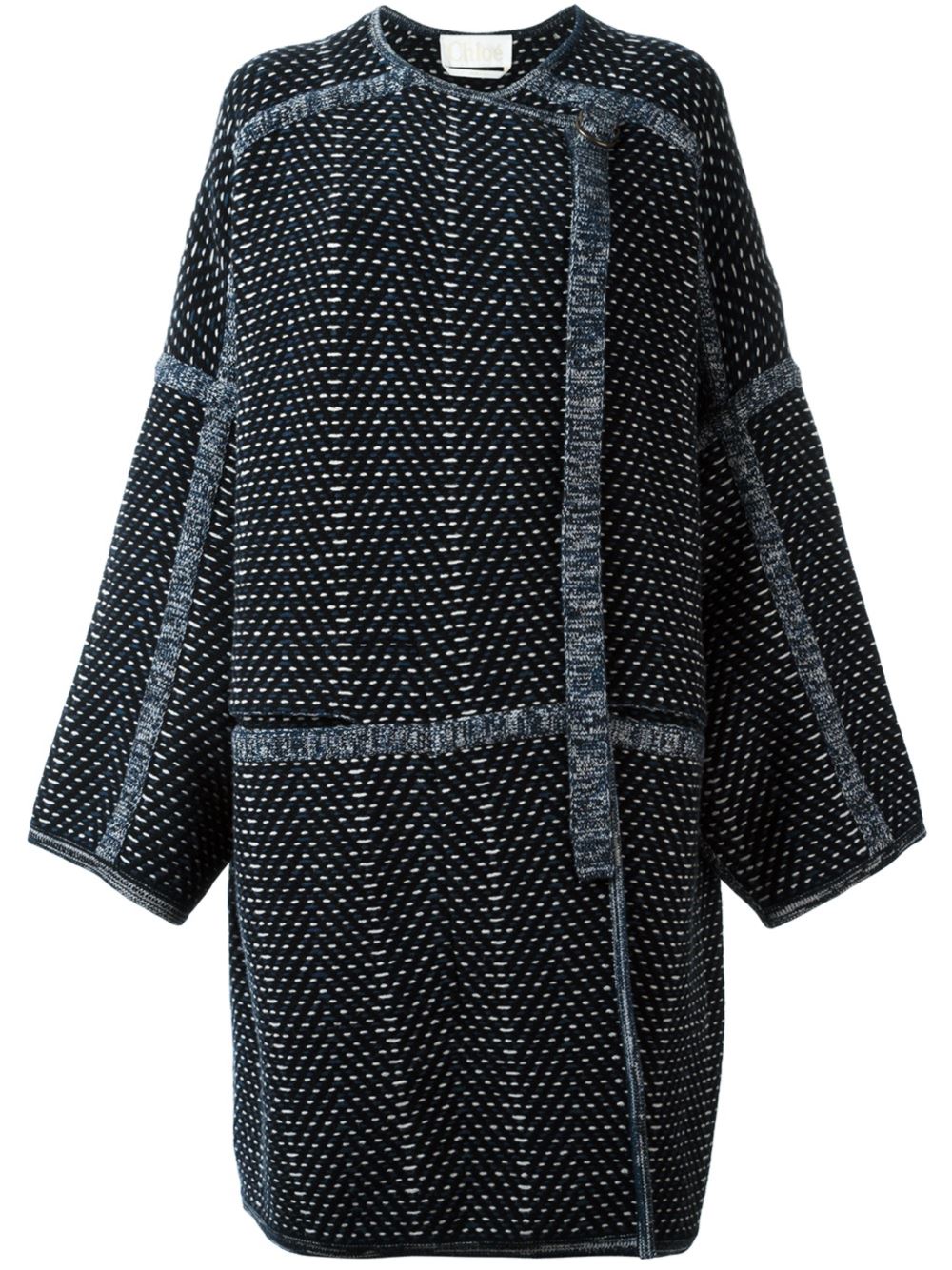 - Chloé 黑色白色海军蓝色 羊毛与羊绒混纺 中长针织外套。 无领设计, 偏中心正面竖排纽扣, 长袖, 特大款, 中长。