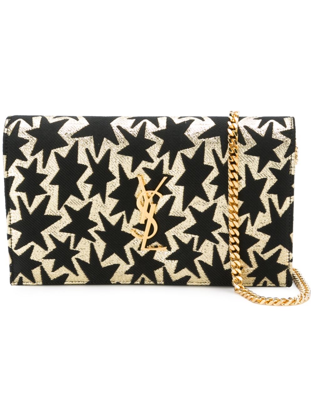 - Saint Laurent 金色与黑色 牛皮 'Monogram'钱包。 正面有翻盖, 金色标牌, 搭链肩带, 多个夹层, 内置拉链夹层。