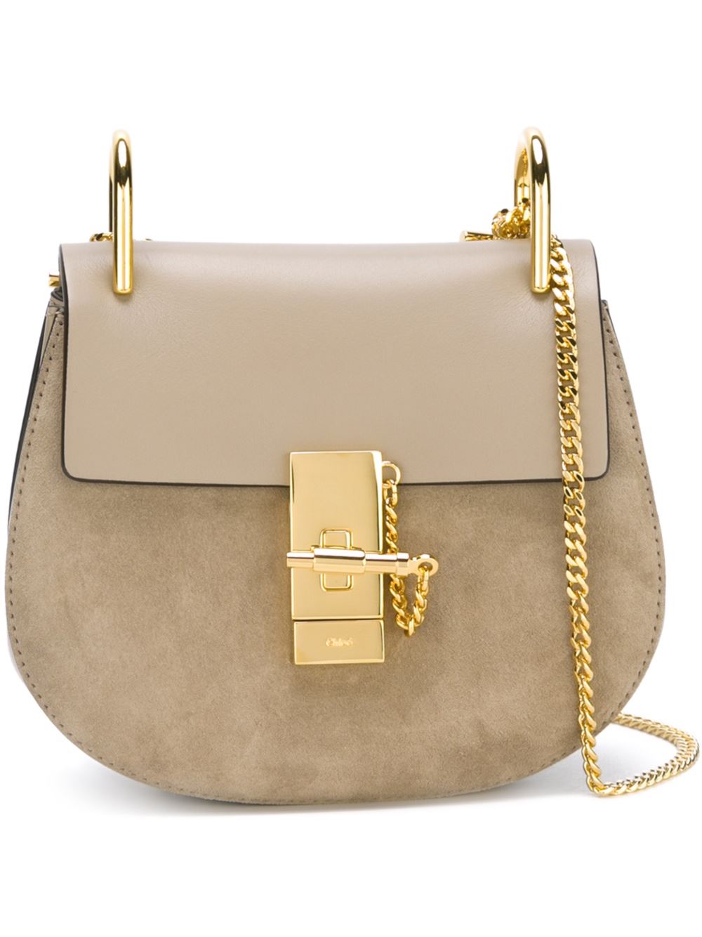 - Chloé 灰色 小牛皮与绒面皮 'Drew'斜挎包。 翻盖饰有旋扣, 金色五金配件, 正面饰有浮雕品牌标记, 金色铁链肩带, 对比滚边, 绒面皮衬里, 内置贴袋。