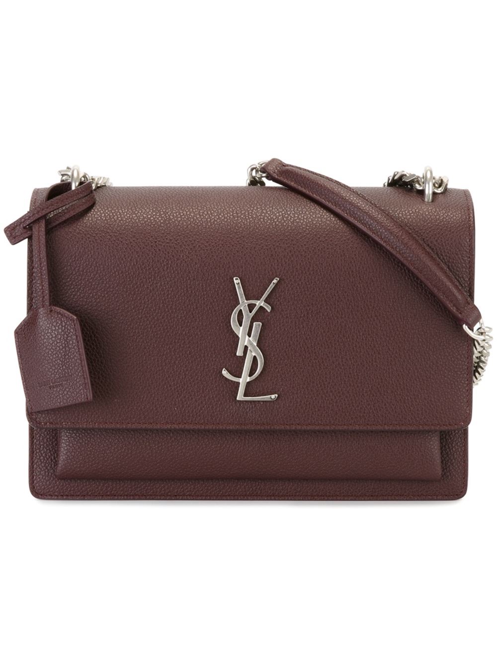 - Saint Laurent 酒红色 小牛皮 'Sunset Monogram'中号斜挎包。 皮革边饰链式肩带, 银色五金配件, 钥匙吊, 翻盖饰有插入式的摁扣, 内置标签, 内置多个分层, 内置贴袋, 内置标牌。