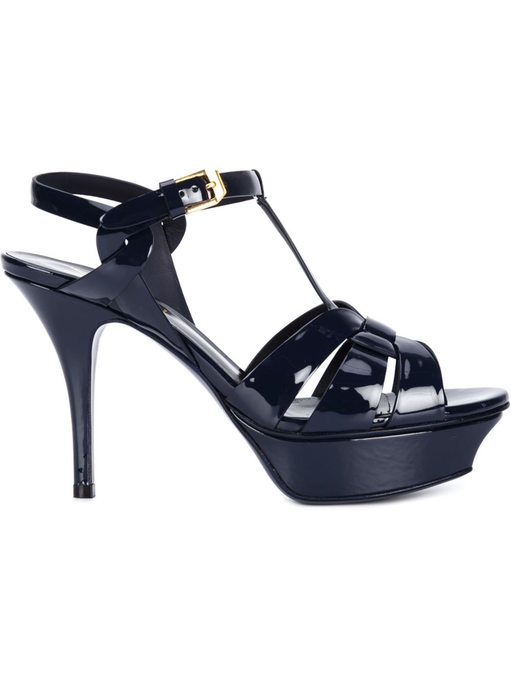 - Saint Laurent 深蓝色 真皮与漆皮 'Tribute'高跟凉鞋。 编织设计, T字鞋带, 搭扣踝带, 厚鞋底, 鞋垫饰有品牌浮雕, 中高细跟。
