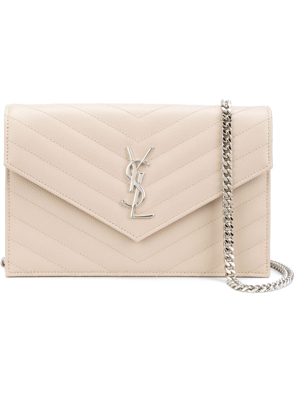 - Saint Laurent 白色与灰色 牛皮 'Monogram Envelope‘钱包。 金色标牌, 正面有翻盖, 金色金属边饰, 摁扣, 内置拉链口袋, 多个夹层。