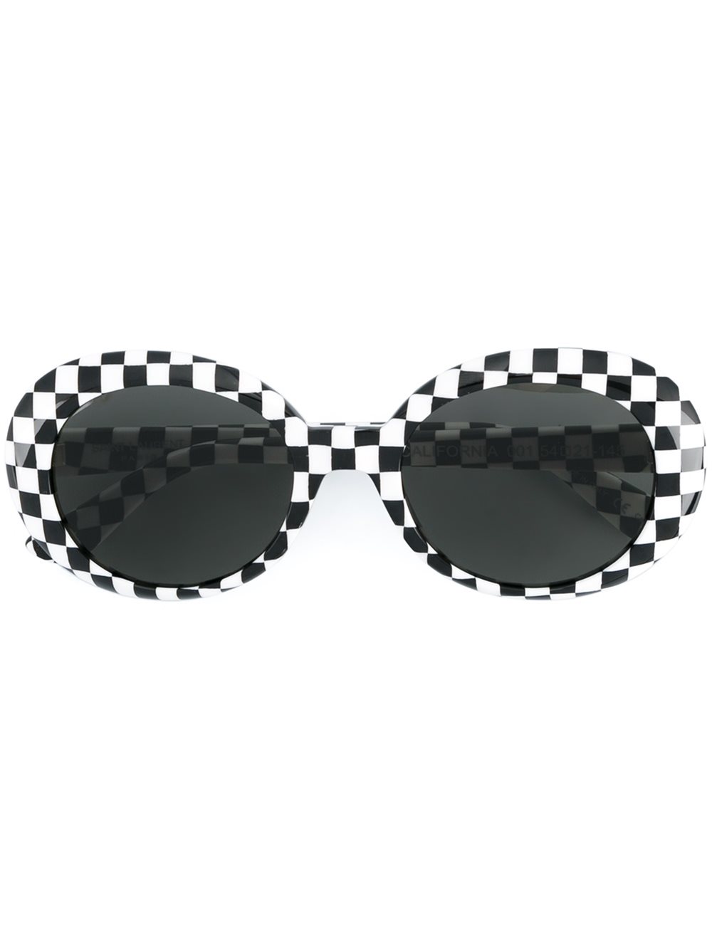 - Saint Laurent 黑色与白色 醋酸纤维 'SL 98 California'太阳眼镜。 方格花纹, 圆框, 深色镜片, 浮雕标志, 尖角尾镜腿。