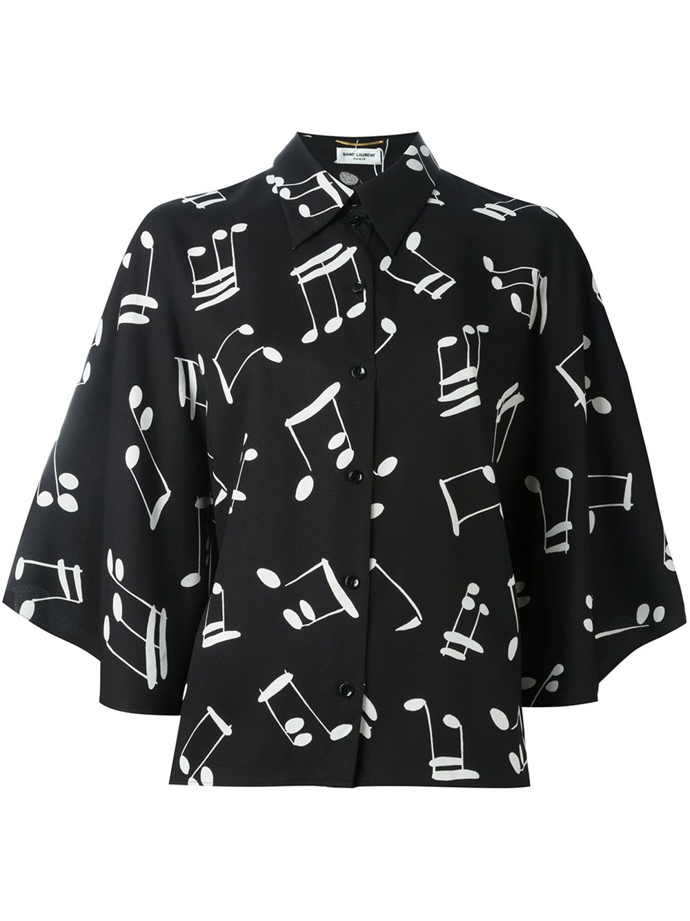 - Black music note printed shirt from Saint Laurent featuring a classic collar, a front button placket, wide three quarter length sleeves and a straight hem.
