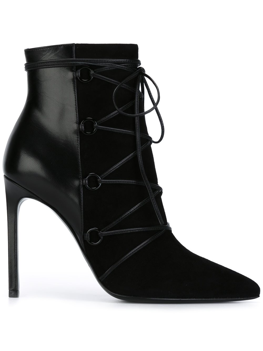 - Saint Laurent 黑色 小牛皮 尖头及踝靴。 尖头, 正面绑带, 鞋垫饰有品牌标识, 细高跟, 侧置拉链。
