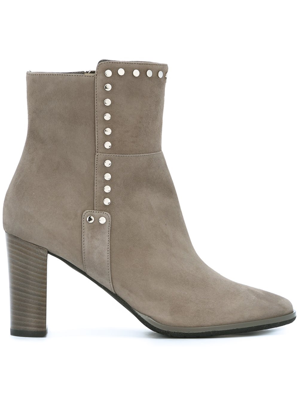 - Jimmy Choo 灰色 绒面皮 'Harlow 80'短靴。 圆头, 及踝, 银色铆钉, 皮革质鞋垫, 中高粗跟, 皮革质鞋底。