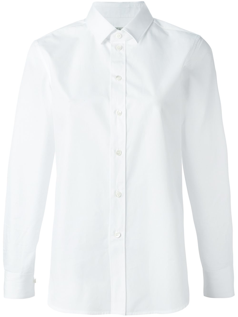 - Saint Laurent 白色 全棉 经典长袖衬衫。 经典衣领, 正面纽扣, 长袖, 搭扣袖口, 曲线形底边。