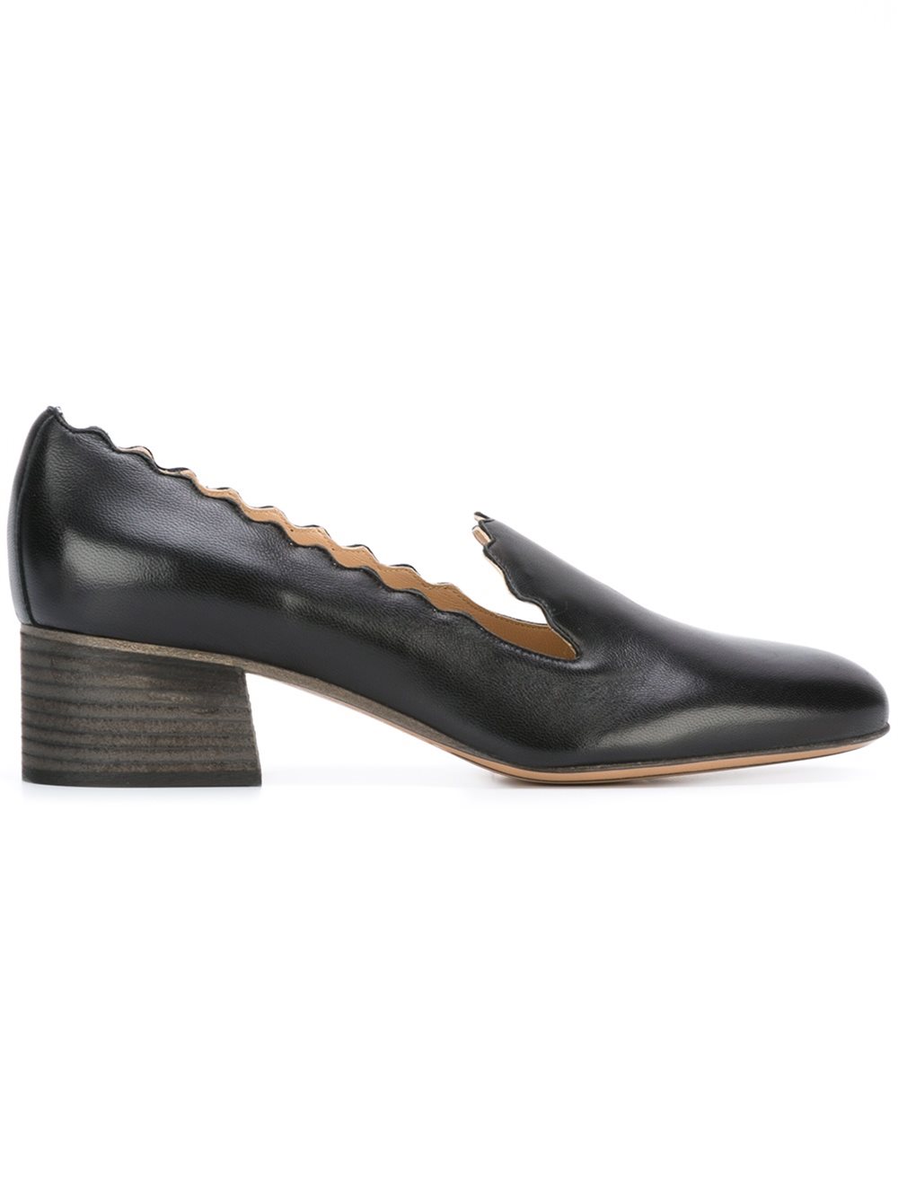 - Chloé 黑色 牛皮 Lauren'高跟鞋。 杏仁形鞋尖, 扇贝形细节, 鞋垫饰有品牌浮雕, 叠跟, 粗中跟。