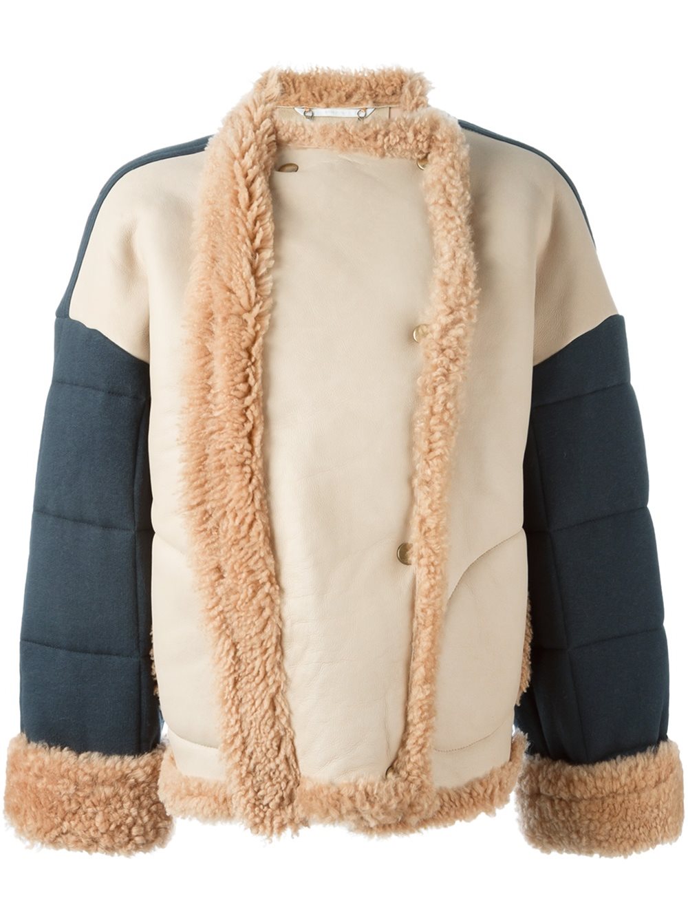 - Chloé 米色与灰色 羊皮与全棉 绒毛衬垫夹克。 偏中心正面竖排纽扣, 长袖, 绗缝效果, 弹性松紧底边。