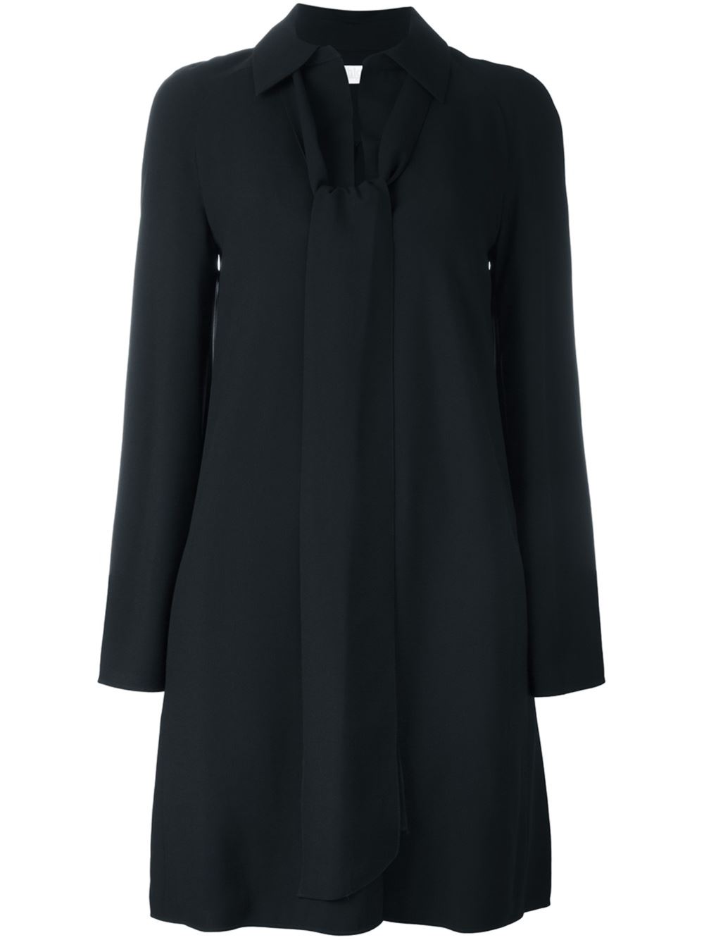 - Chloé 黑色 丝混纺 领口打结连衣裙。 经典衣领, 带结衣领, 长袖, 衬衫式廓形, 中长, 平直下摆, 后置褶饰细节。
