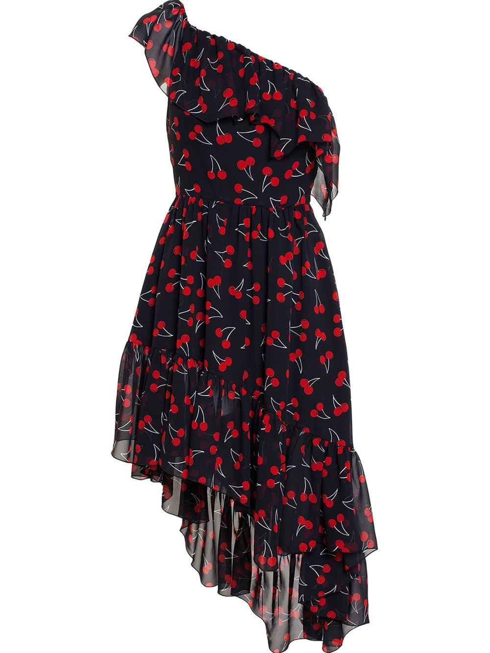 - Saint Laurent 黑色 红色 丝绸 斜肩垂坠式连衣裙。