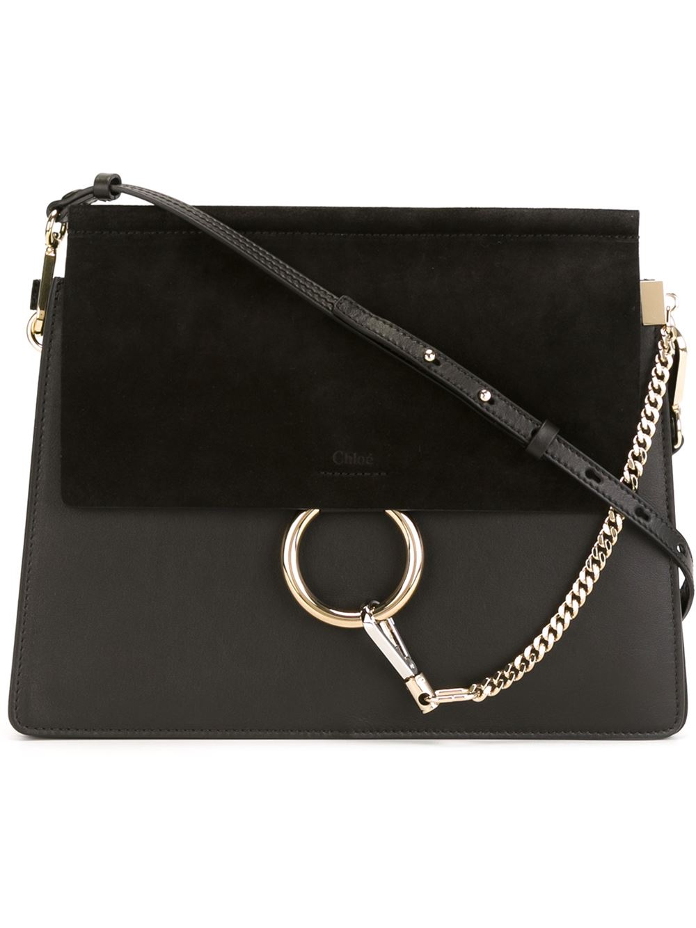 - Chloé 黑色 绒面皮与牛皮 'Faye'单肩包。 翻盖饰有插入式的摁扣, 可调肩带, 正面饰有浮雕品牌标记, 金色五金配件, 绒面皮衬里, 内置拉链口袋, 内置标签。