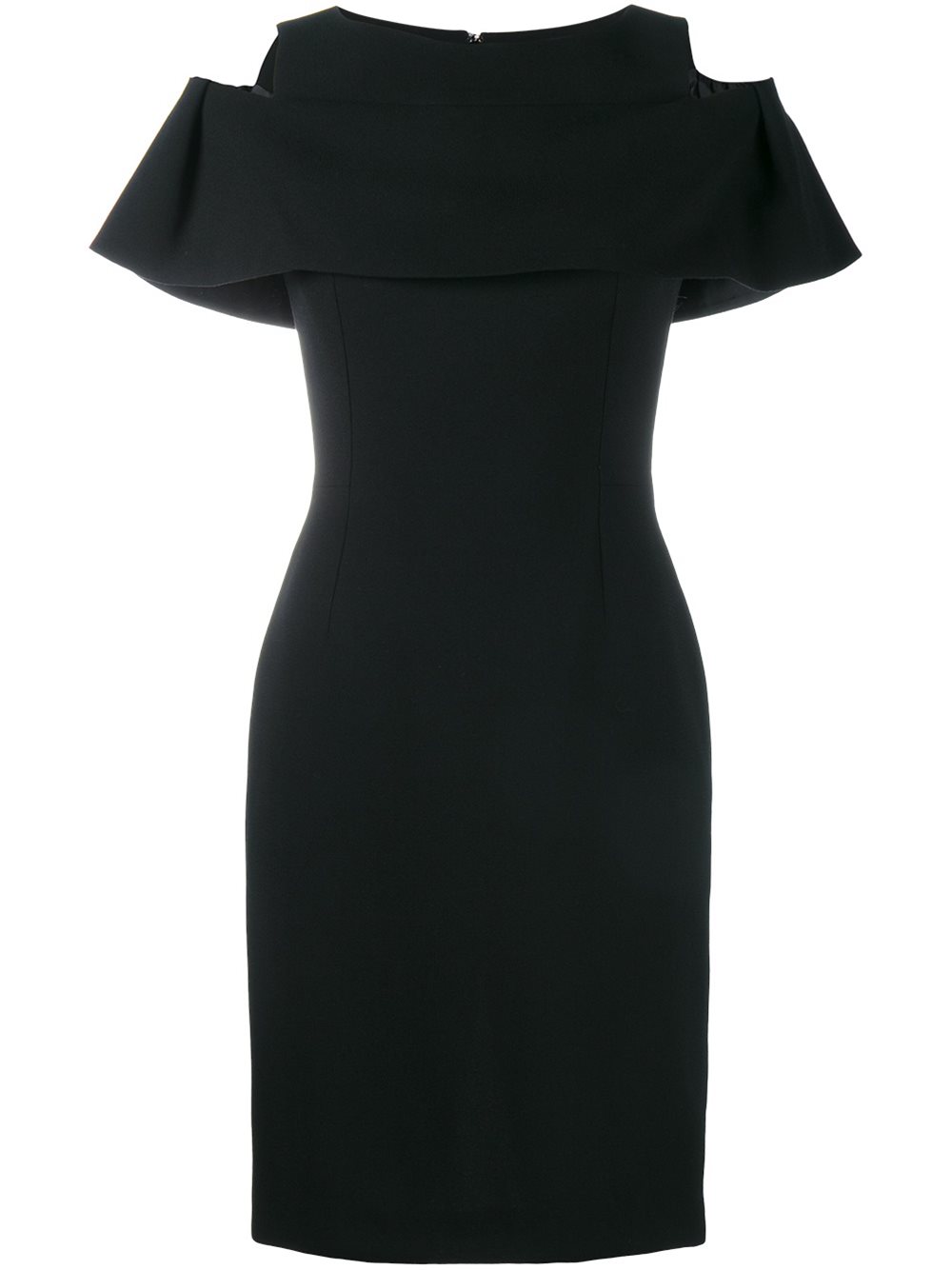 - Osman 黑色 羊毛 露肩连衣裙。 圆领, 短袖, 后置拉链, 合身廓形, 中后背开衩, 短款。