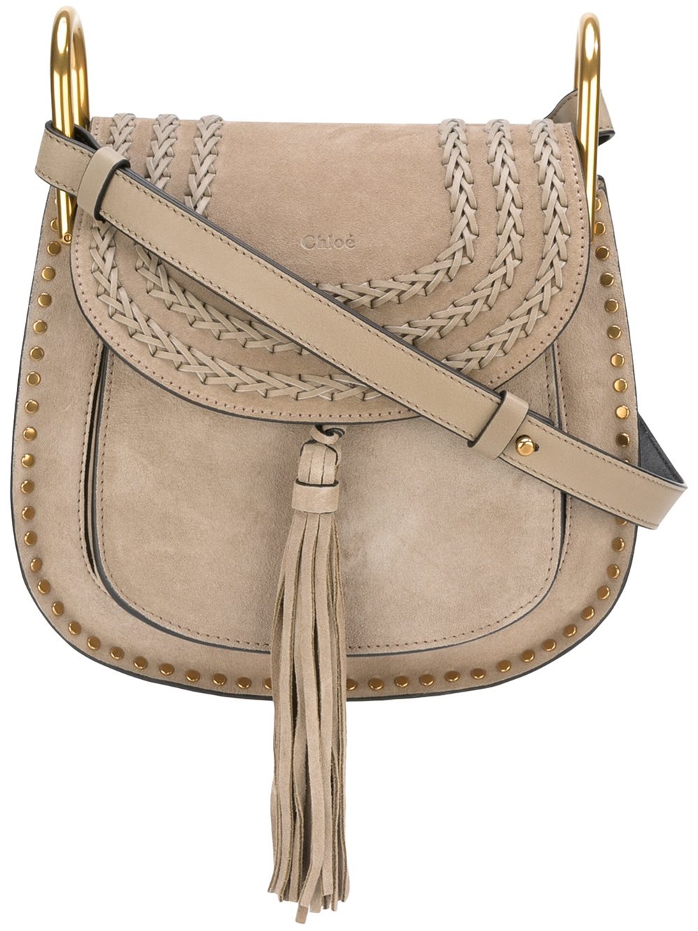 - Chloé 灰色 小牛绒面皮与小牛皮 'Hudson'小号单肩包。 金色五金配件, 金色铆钉, 针脚细节, 流苏挂饰, 可调肩带, 翻盖饰有插入式的摁扣, 正面开口式口袋, 内置多个分层, 绒面皮衬里。