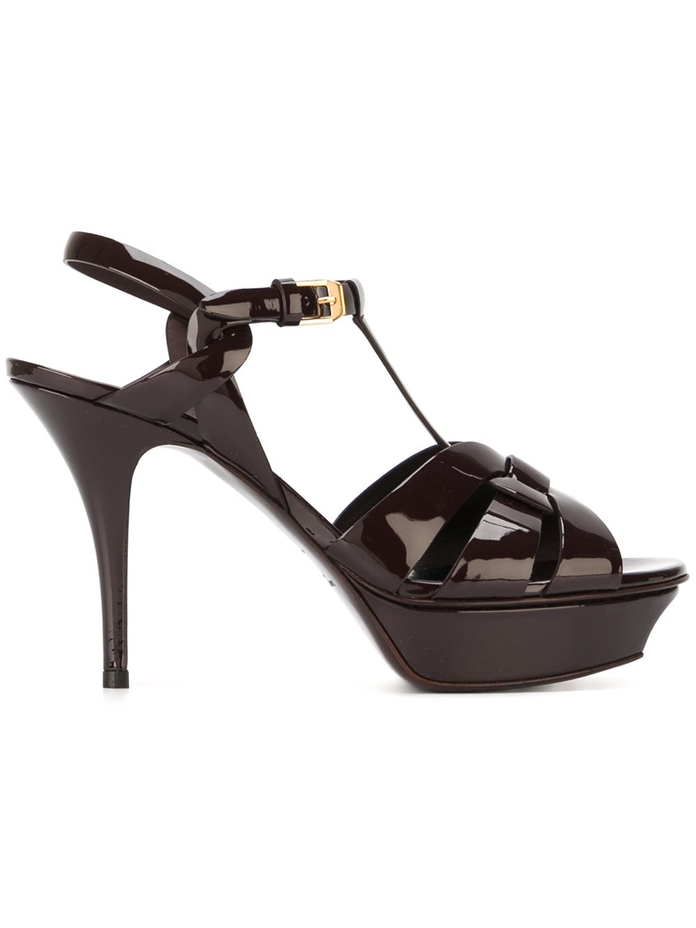 - Dark red patent leather 'Tribute' sandals from Saint Laurent featuring an open toe, a branded insole, a woven design, a t-strap to the front, an ankle strap with a side buckle fastening, a platform sole and a mid high stiletto heel.
