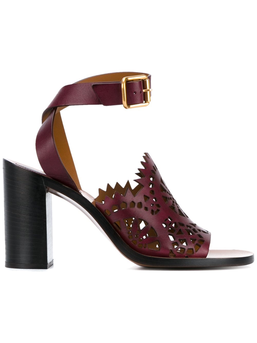- Chloé (寇依) 酒红色 牛皮 'Kelby'凉鞋。 露趾, 激光切割细节, 搭扣踝带, 鞋垫饰有品牌浮雕。
