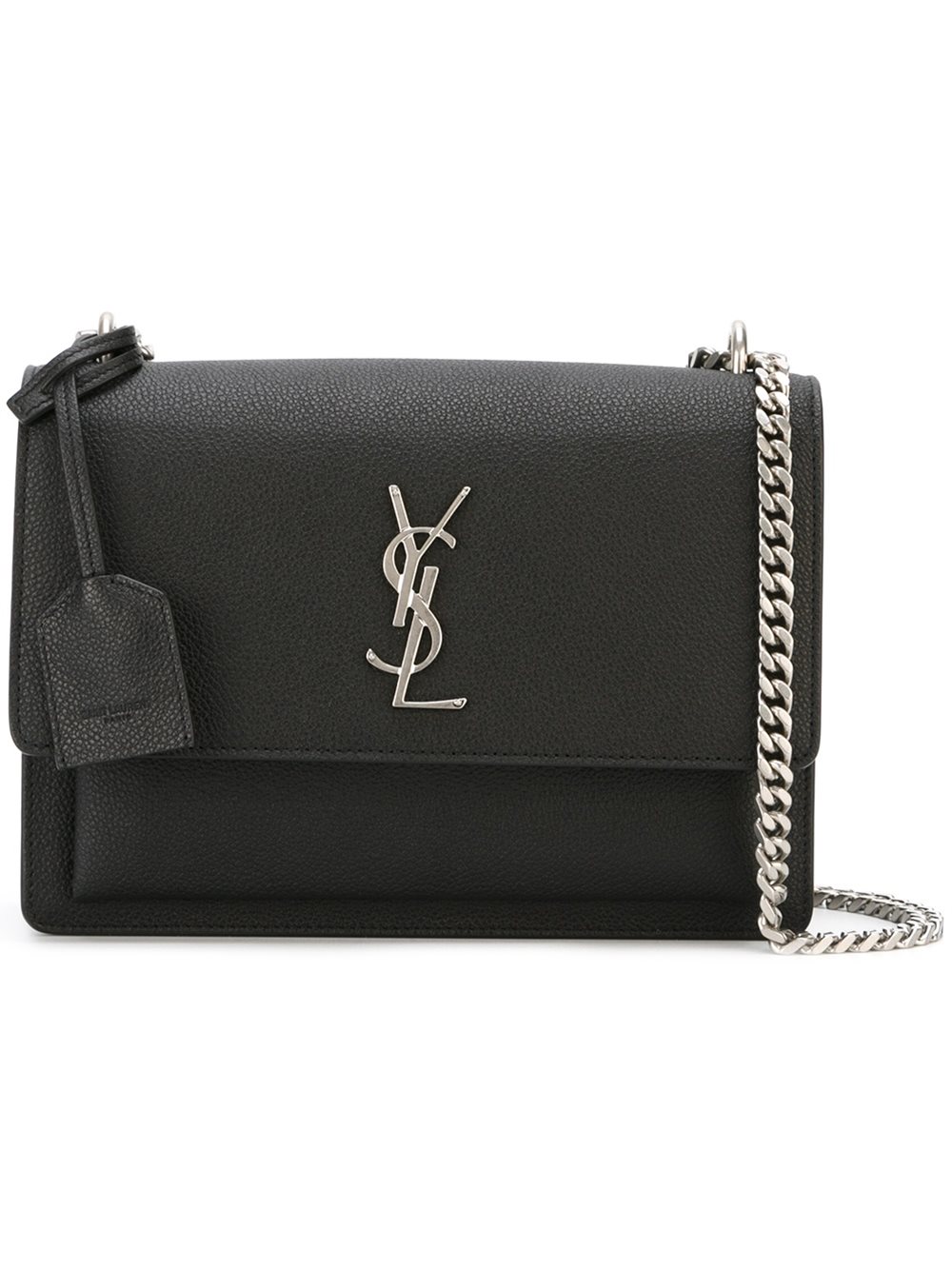 - Saint Laurent (圣罗兰) 黑色 小牛皮 'Sunset Monogram'中号斜挎包。 搭链肩带, 银色五金配件, 钥匙吊, 正面标志贴, 翻盖饰有插入式的摁扣, 内置贴袋, 内置标牌。