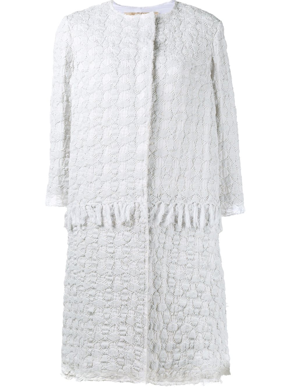 - By Walid 白色 全棉 钩编外套。 圆领, 暗扣, 七分袖, 流苏细节, 及膝, 磨损边。