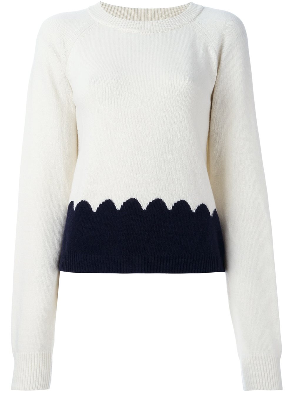 - Chloé 米白色与海军蓝色 羊毛与羊绒混纺 扇贝形边毛衣。 罗纹针织圆领, 双色设计, 长袖, 罗纹底边及袖口。