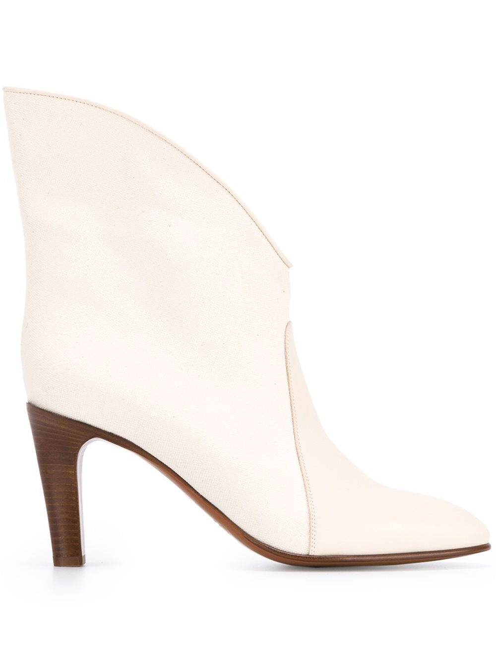 - Chloé (寇依) 白色 牛皮与全棉 'Kole'及踝靴。 穿套式, 杏仁形鞋尖, 高跟。