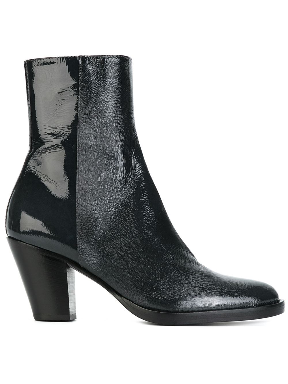 - A.F.Vandevorst 深蓝色 漆皮 粗中跟短靴。 杏仁形鞋尖, 粗中跟, 侧置拉链。这件商品尺码偏小,请选择大半号。