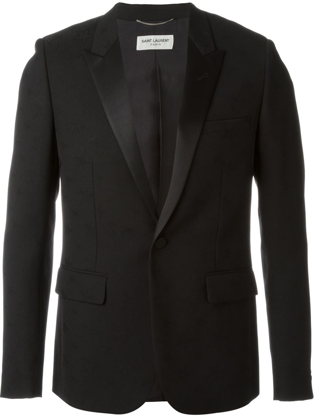 - Saint Laurent 黑色 羊毛与丝绸 塔士多西装夹克。 尖翻领, 大型嵌线胸袋, 正面纽扣, 两个正面盖袋, 长袖, 搭扣袖口, 中后背开衩。