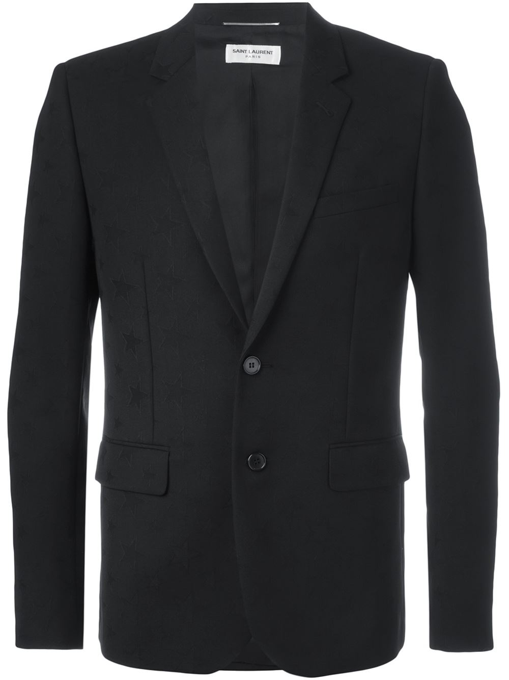 - Saint Laurent 黑色 羊毛 星星提花西装夹克。 正面纽扣, 梯形翻领, 长袖, 假搭扣袖口, 两个正面盖袋, 平直下摆。