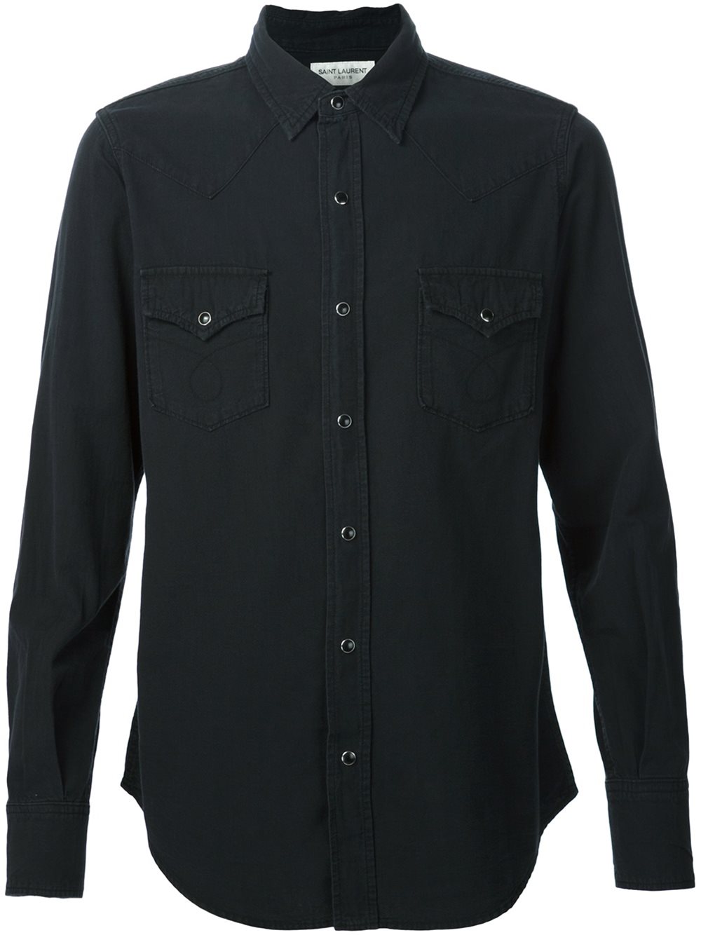 - Saint Laurent (圣罗兰) 黑色 全棉 经典牛仔衬衫。 经典衣领, 摁扣, 两个胸袋, 长袖, 袖口饰有摁扣, 曲线形底边。
