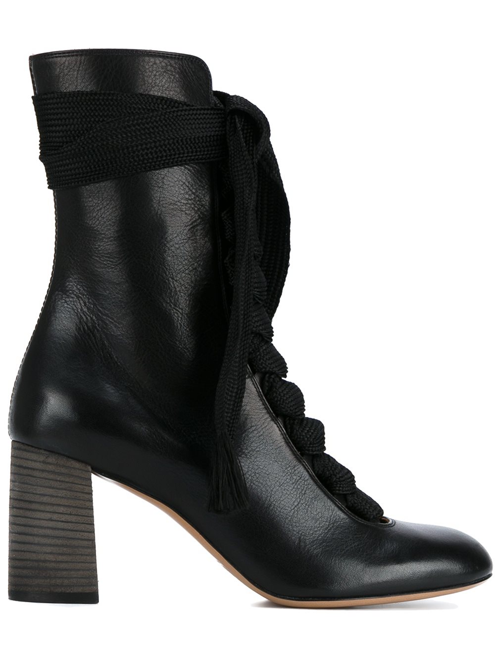 - Chloé (寇依) 黑色 牛皮 'Harper'及踝靴。 杏仁形鞋尖, 正面绑带, 侧置拉链。