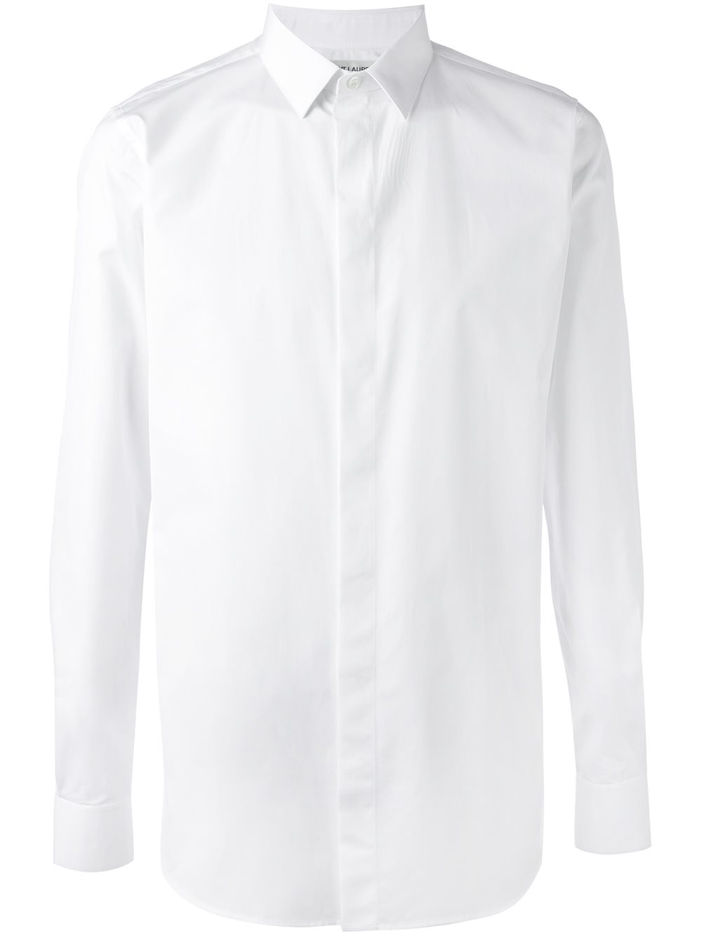 - Saint Laurent (圣罗兰) 白色 丝绸 经典长袖衬衫。 经典衣领, 隐藏式正面开合, 长袖, 搭扣袖口, 曲线形底边。这件商品尺码适中。