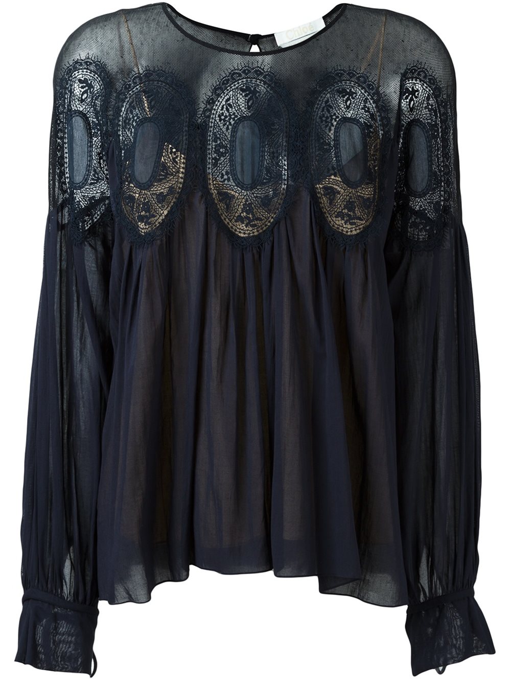 - Chloé 海军蓝色与裸色 丝绸棉质亚麻混纺 蕾丝罩衫。 圆领, 半透明设计, 百褶细节, 长袖, 后面有钥匙孔细节。