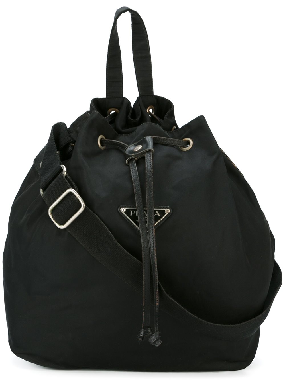 - Prada古着 黑色 经典水桶包。 正面标志贴, 可调肩带, 顶部有一个手柄, 抽绳系带, 内置标贴。这件商品源自于1990年代期间。请注意,古着(vintage)商品并非新的,因此可能有轻微的瑕疵。