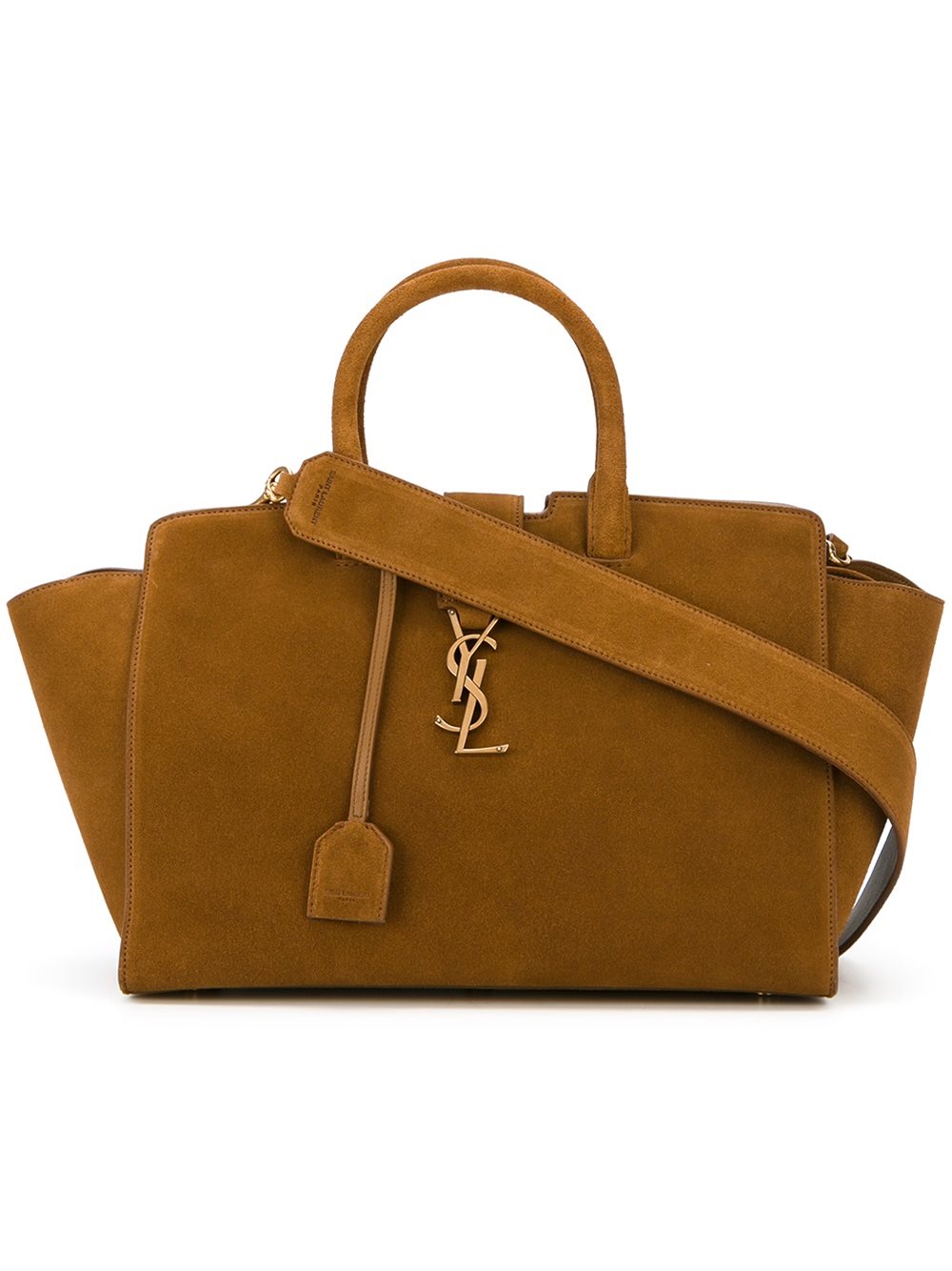 - Saint Laurent (圣罗兰) 褐色 小牛绒面皮 'Monogram Cabas'小号手提包。 顶部有弧状手柄, 可拆卸肩带, 金色五金配件, 钥匙吊, 顶部饰有翻盖, 正面标志贴, 顶置拉链, 内置贴袋, 内置标牌。