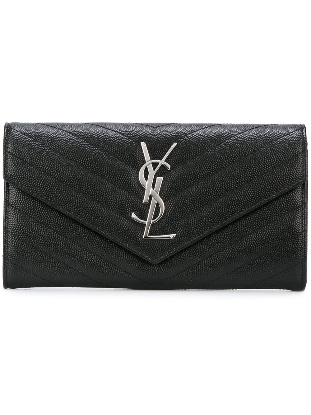 - Saint Laurent (圣罗兰) 黑色 牛皮 'Monogram'大号钱包。 正面标志贴, 银色五金配件, 翻盖饰有摁扣, 内置标签, 内置多个卡槽, 内置拉链夹层。