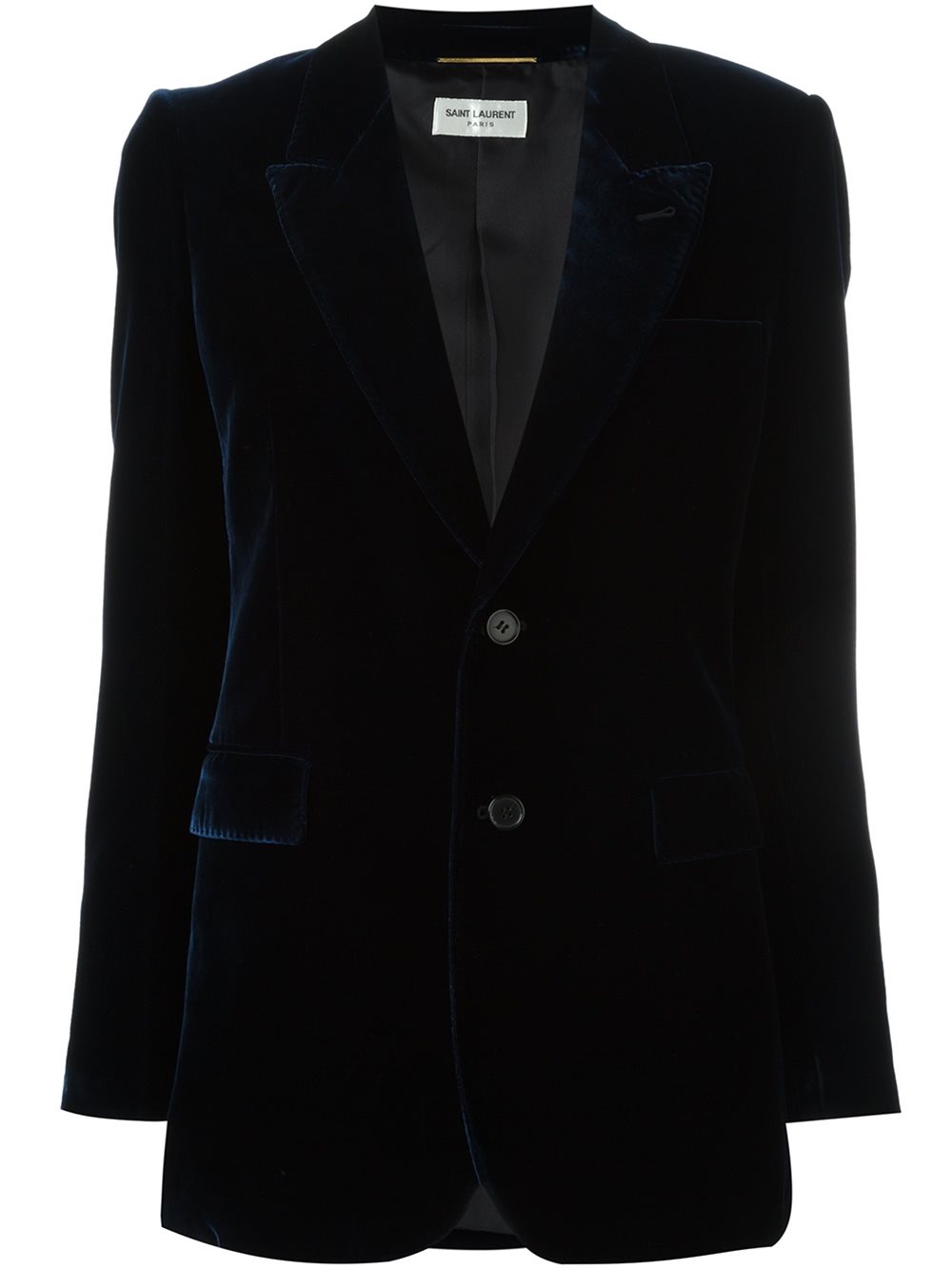 - Saint Laurent (圣罗兰) 蓝色 丝质与棉质混纺 丝绒西装外套。 尖翻领, 正面纽扣, 胸袋, 两个正面盖袋, 长袖, 搭扣袖口, 中后背开衩, 全衬里。