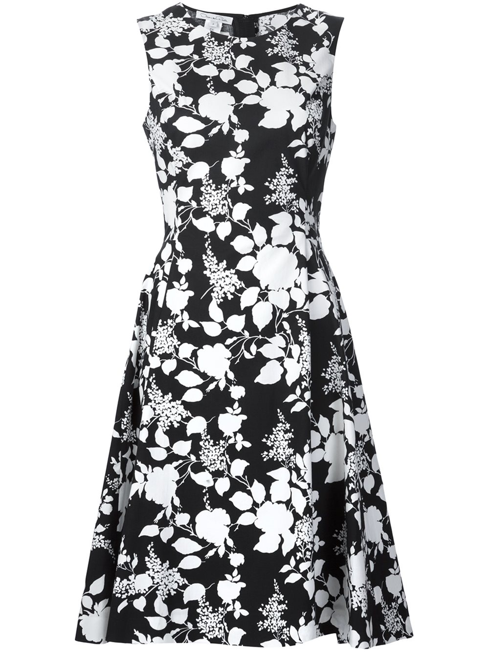- Oscar de la Renta 黑色与白色 混棉 无袖伞状花卉连衣裙。