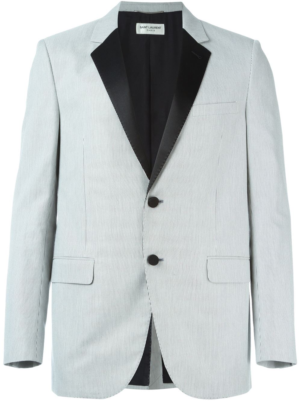 - Saint Laurent 白色与黑色 对比翻领西装夹克。 梯形翻领, 细条纹, 胸袋, 正面纽扣, 两个正面盖袋, 长袖, 搭扣袖口, 中后背开衩。