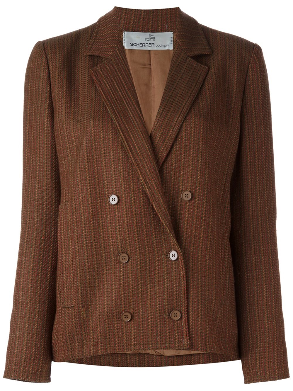 - Jean Louis Scherrer古着 褐色与多色 羊毛 古着双排扣夹克。 梯形领, 侧身口袋, 长袖, 搭扣袖口, 平直下摆。这件商品源自于1970年代期间。请注意,古着(vintage)商品并非新的,因此可能有轻微的瑕疵。