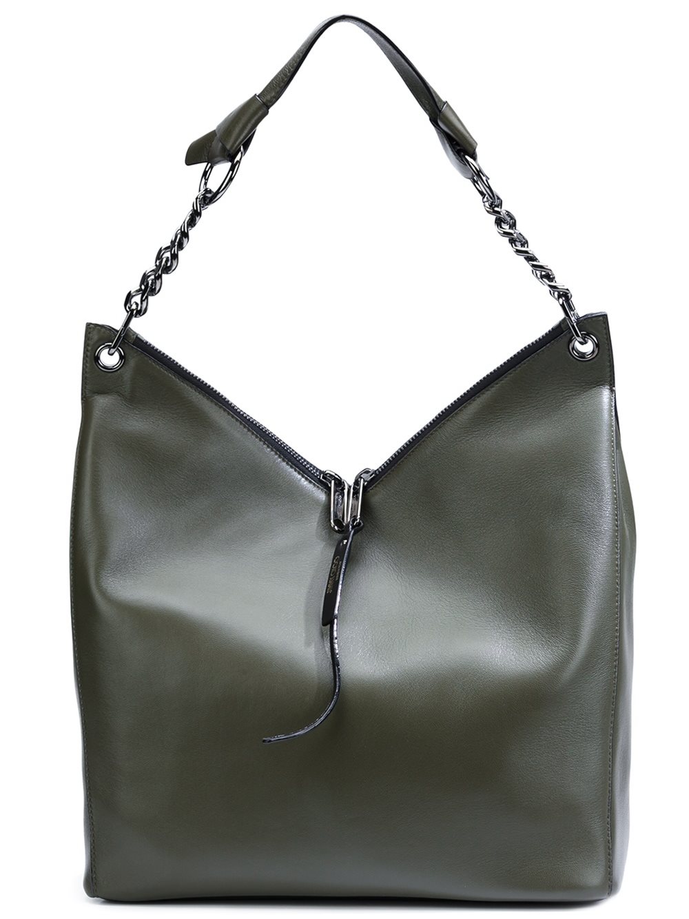 - Jimmy Choo (周仰杰) 军绿色 纳帕皮 'Raven'单肩包。 皮革边饰链式肩带, 顶置拉链, 内置贴袋。