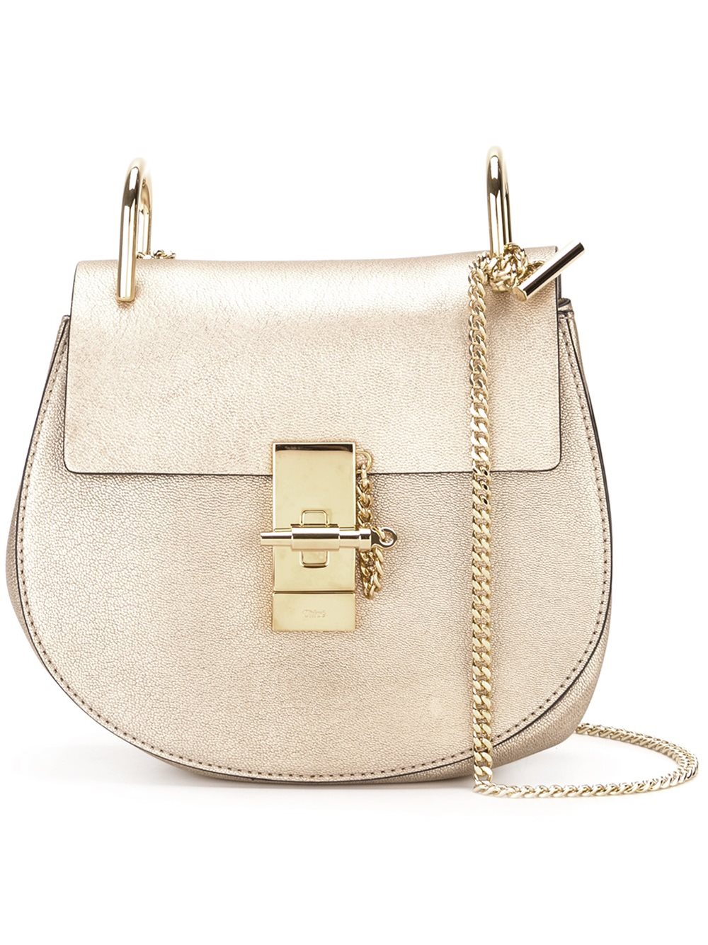 - Chloé (寇依) 金色 绒面皮 'Drew'单肩包。 粗质感皮革, 金属光泽, 金色五金配件, 金色铁链肩带, 翻盖饰有旋扣, 正面饰有别针, 浮雕标志, 内置贴袋, 绒面皮衬里。