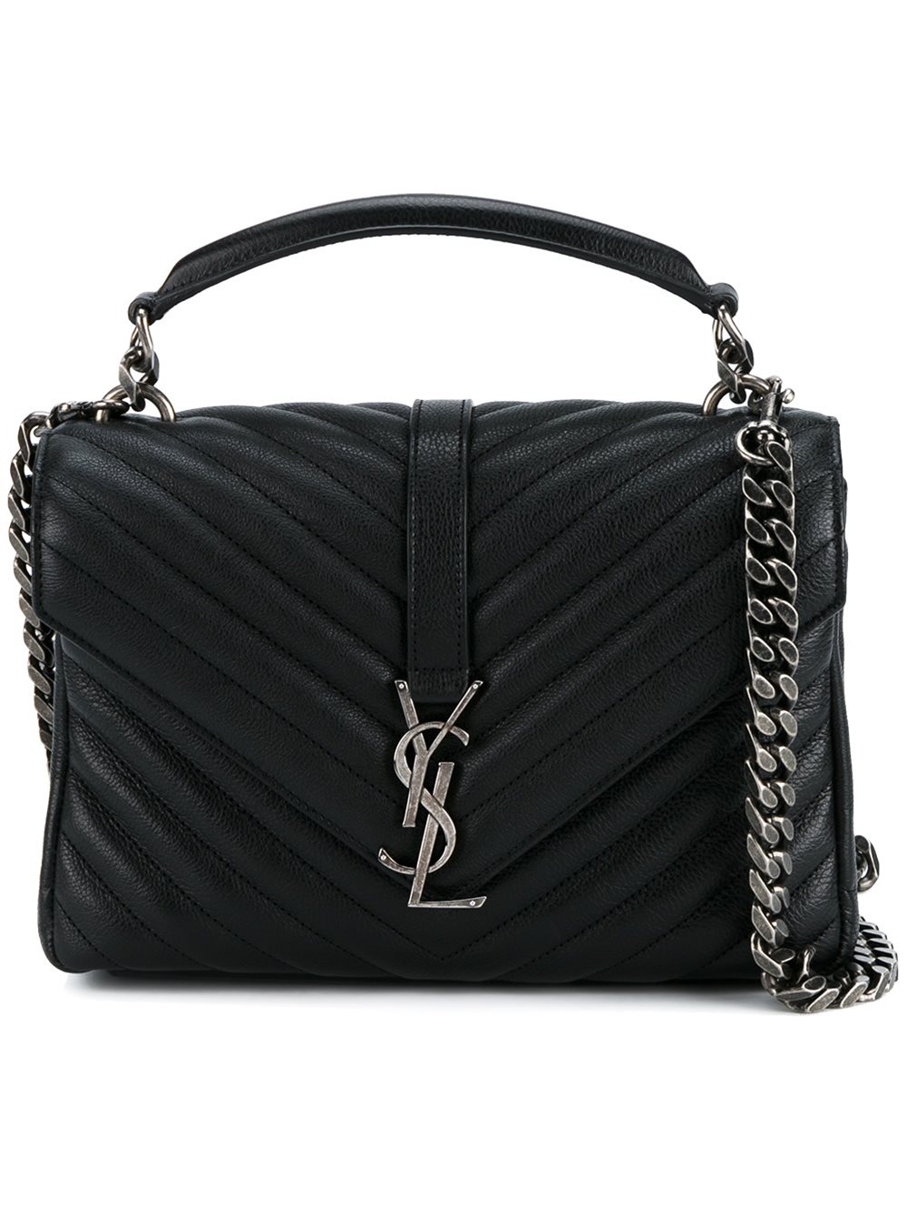 - Saint Laurent (圣罗兰) 黑色 牛皮 'Monogram Collège'中号斜挎包。 顶部有一个手柄, 皮革边饰链式肩带, 银色五金配件, 正面标志贴, 信封式, 翻盖饰有插入式的摁扣, 后置贴袋, 全衬里, 内置拉链口袋, 内置标签。