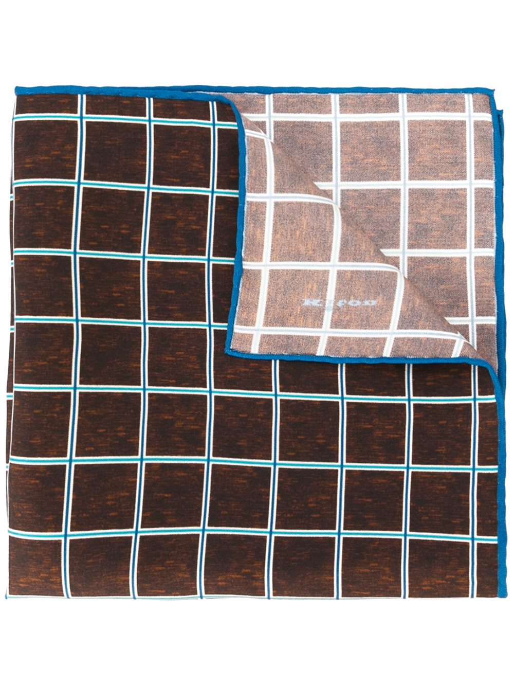 - Kiton 褐色 丝绸 方格口袋方巾。