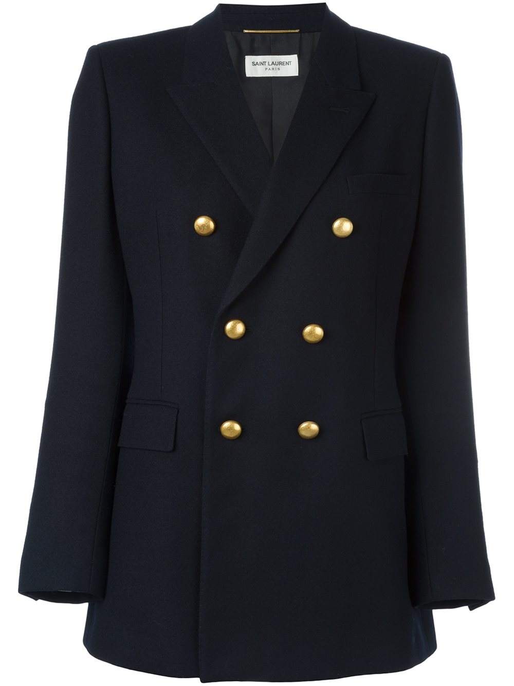 - Saint Laurent (圣罗兰) 深蓝色 全棉与羊毛 'Angie'双排扣夹克。 尖翻领, 正面有双排扣, 胸袋, 两个正面盖袋, 长袖, 搭扣袖口, 中后背开衩, 全衬里, 平直下摆。