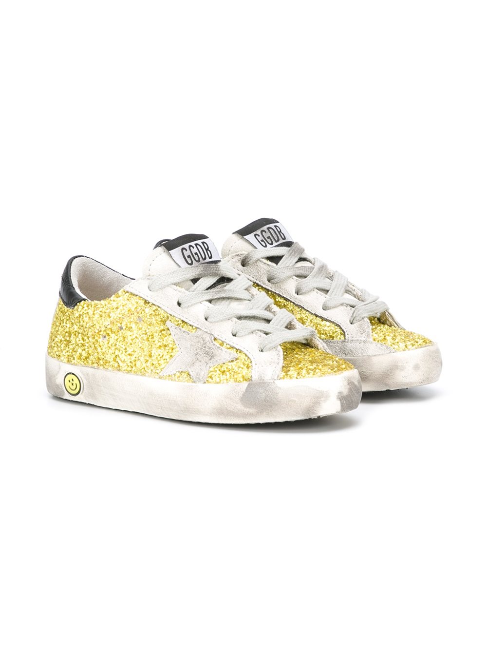 - GOLDEN GOOSE DELUXE BRAND KIDS 黄色 牛皮与绒面皮 'Superstar'板鞋。 圆头, 正面绑带, 鞋垫饰有品牌标识, 正面和侧面有标志, 仿旧效果, 平底橡胶鞋底。